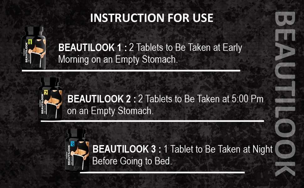 ACTIVE INGREDIENTS BEAUTILOOK 1 Ananas, Brahmi, Galo, Ganthoda Powder, Kalimirch, Kokam, Methi Bija, Nasotar, Kuvarpathu, Shanhpushpi, Vavding, Triphala, Shu Shilajit, Shuddha Guggulu, Shunti, Motha (Musta), Nimbu BEAUTILOOK 2 Variyali, Shankh Bhauma, Yashtimadhu, Gulal, Sakar. Aviputtikar Churna, Draksh, Chitrakadi Vati, Trikatu Triphala, Kuvarpathu BEAUTILOOK 3 Sonamukhi, Gulab patti, Nishoth, Triphala, Kala Namak, Ajmo, Isabgol, Papita, Yatimadhu, Shankhthaima, Punarnava, Gokhsur, Sakar, Kuvarpathu DIRECTION TO USE BEAUTILOOK 1: 2 tablets to be taken at early morning on an empty stomach. BEAUTLOOK 2:2 tablets to be taken at 5:00 PM on an empty stomach. BEAUTILOOK 3:1 tablet to be taken at night before going to bed