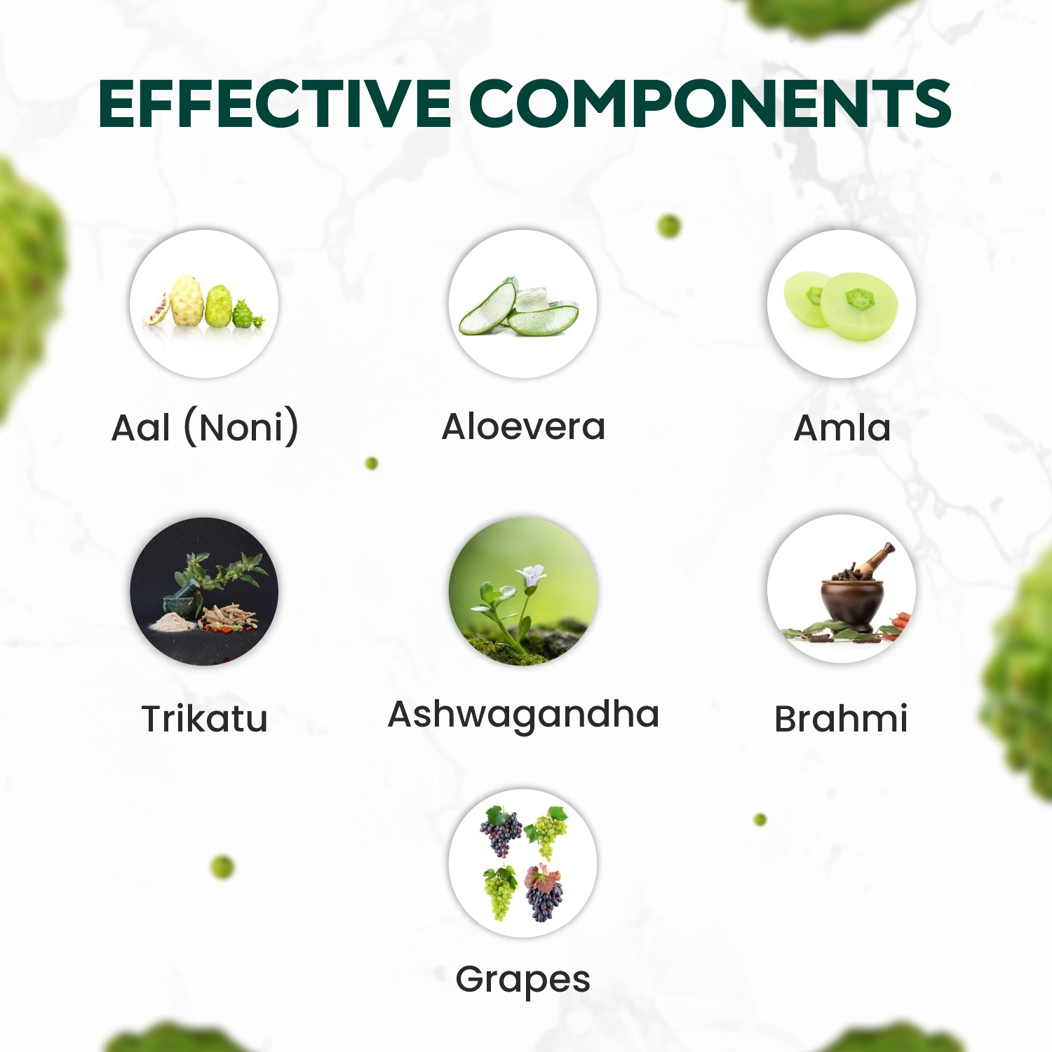 KEY BENEFITS ACTIVE INGREDIENTS Aal (Noni), Aloevera, Amla, Trikatu, Ashwagandha, Vidang, Brahmi, Grapes, Rasayan churna DIRECTION TO USE Adult: 30 ml daily with a glass of lukewarm water on an empty stomach in the morning. Kids: 15 ml daily with a glass of lukewarm water on an empty stomach in the morning. Or as directed by healthcare professionals. A A powerful antioxidant May support heart health Great immune booster Improves skin health Improves digestion Help reduce joint pain