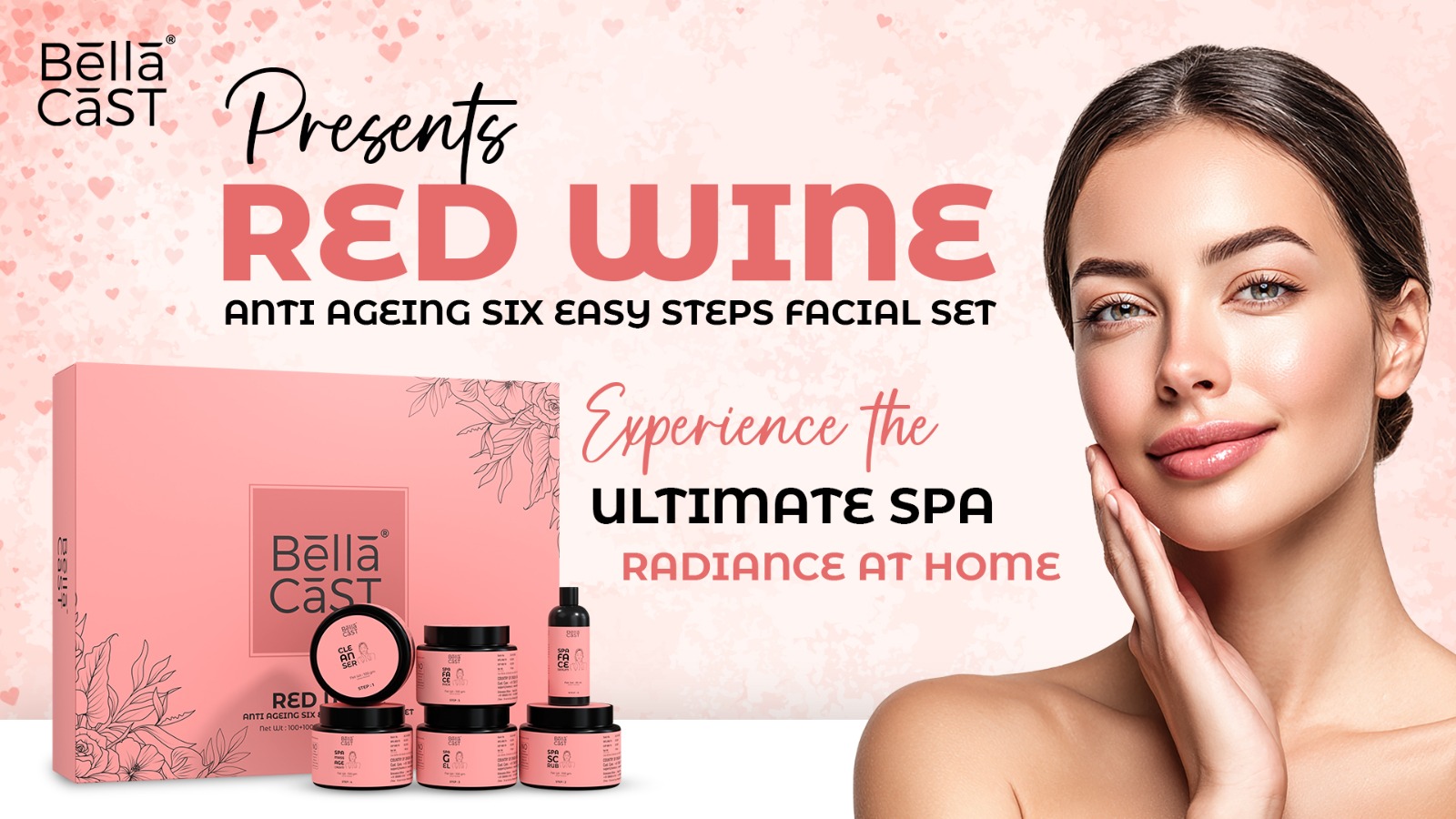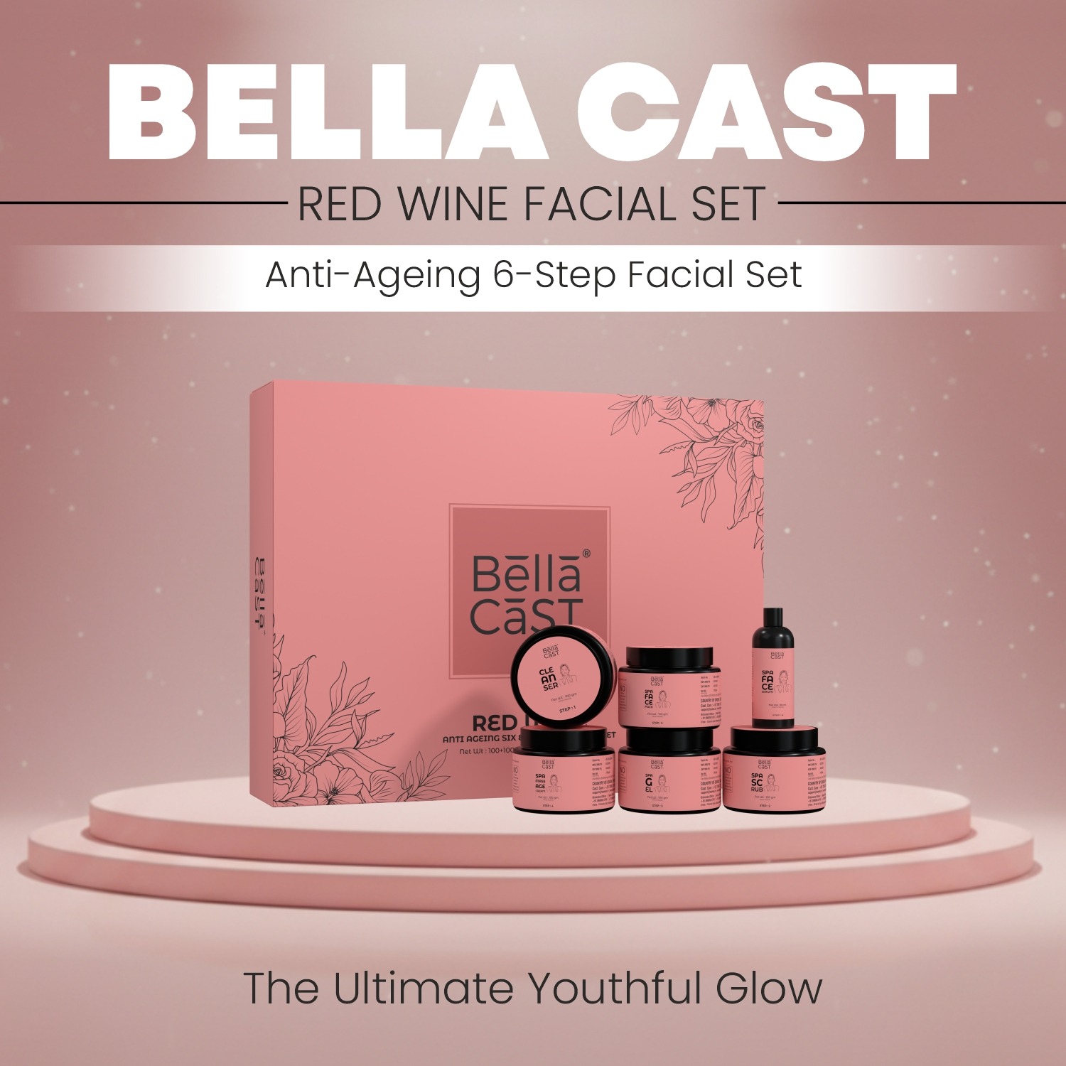 Rejuvenate your skin with the BellaCast Anti-Ageing Spa Kit, a comprehensive 6-step professional facial treatment. Infused with the antioxidant power of Red Wine, this kit is designed to fight fine lines, wrinkles, and dullness, giving you a salon-like glow at home.