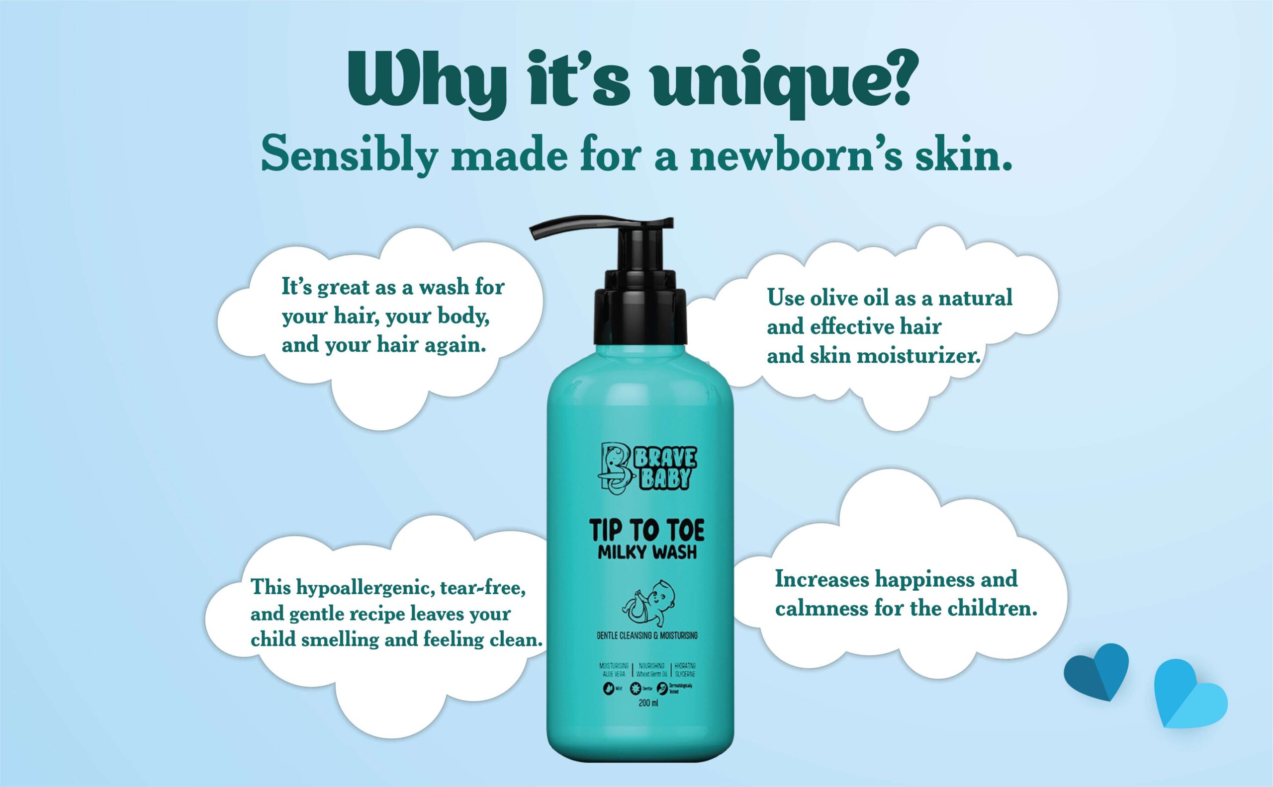 Brave Baby Top to Toe Milky Wash is made with natural ingredients that have gentle cleansing and moisturizing properties. It contains beneficial milk proteins to prevent hair from drying out after washing, moisturizing aloe vera glycerin, and wheat germ oil to protect the hair. It is free of parabens, SLS/SLES, phthalates, phenoxyethanol, and ethanolamine, making the product gentle and non-irritating to the eyes. Best for young children.
